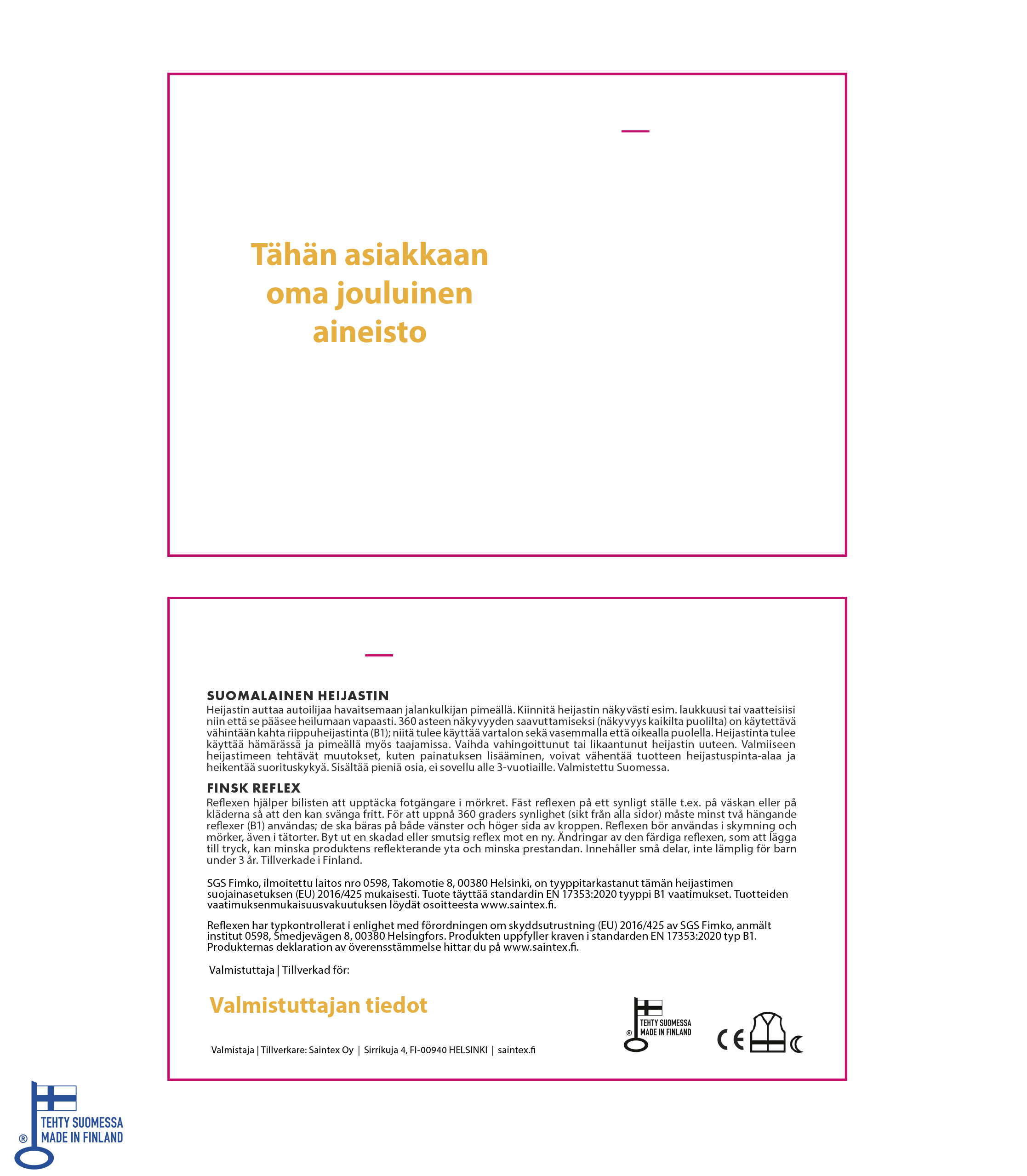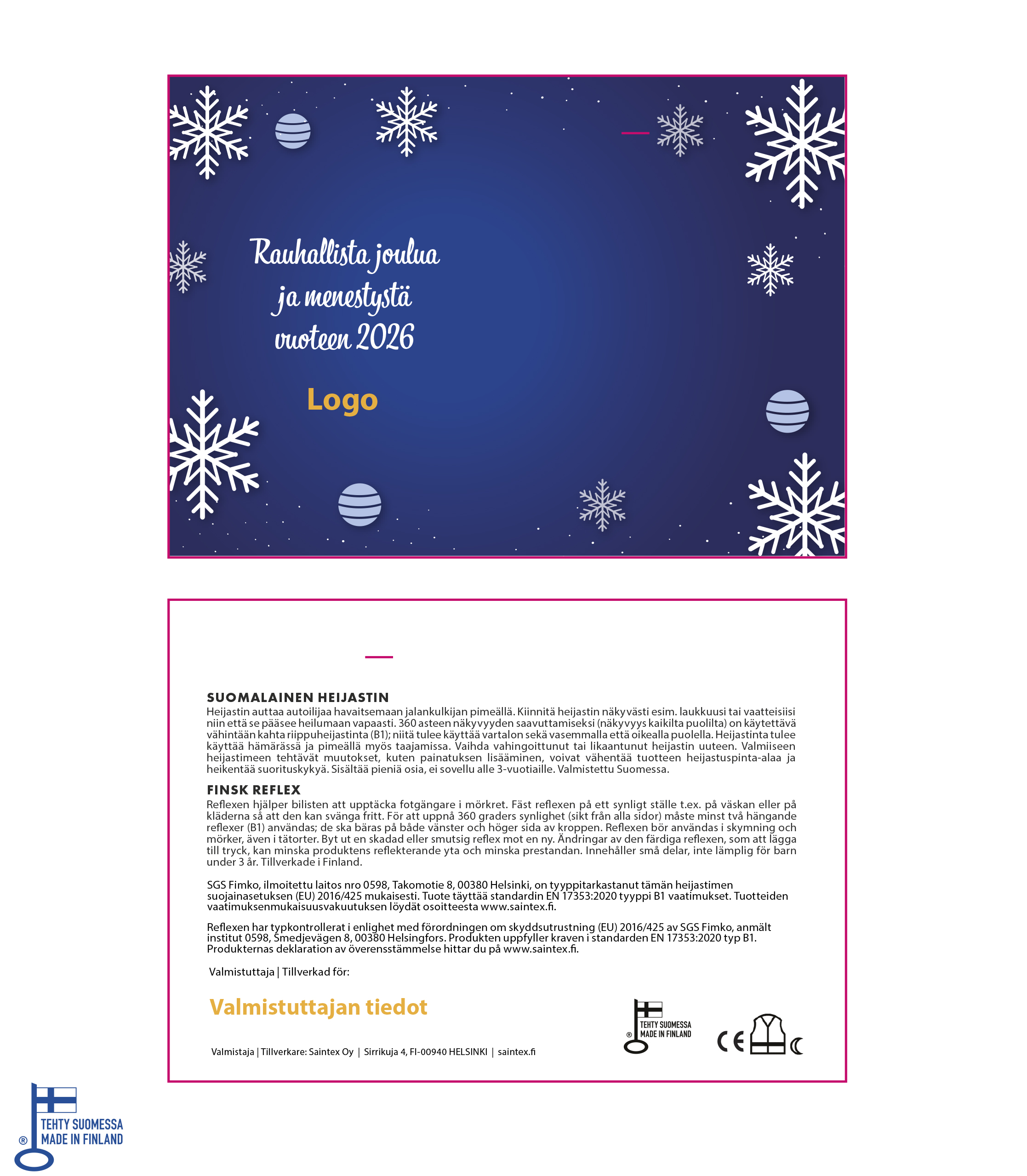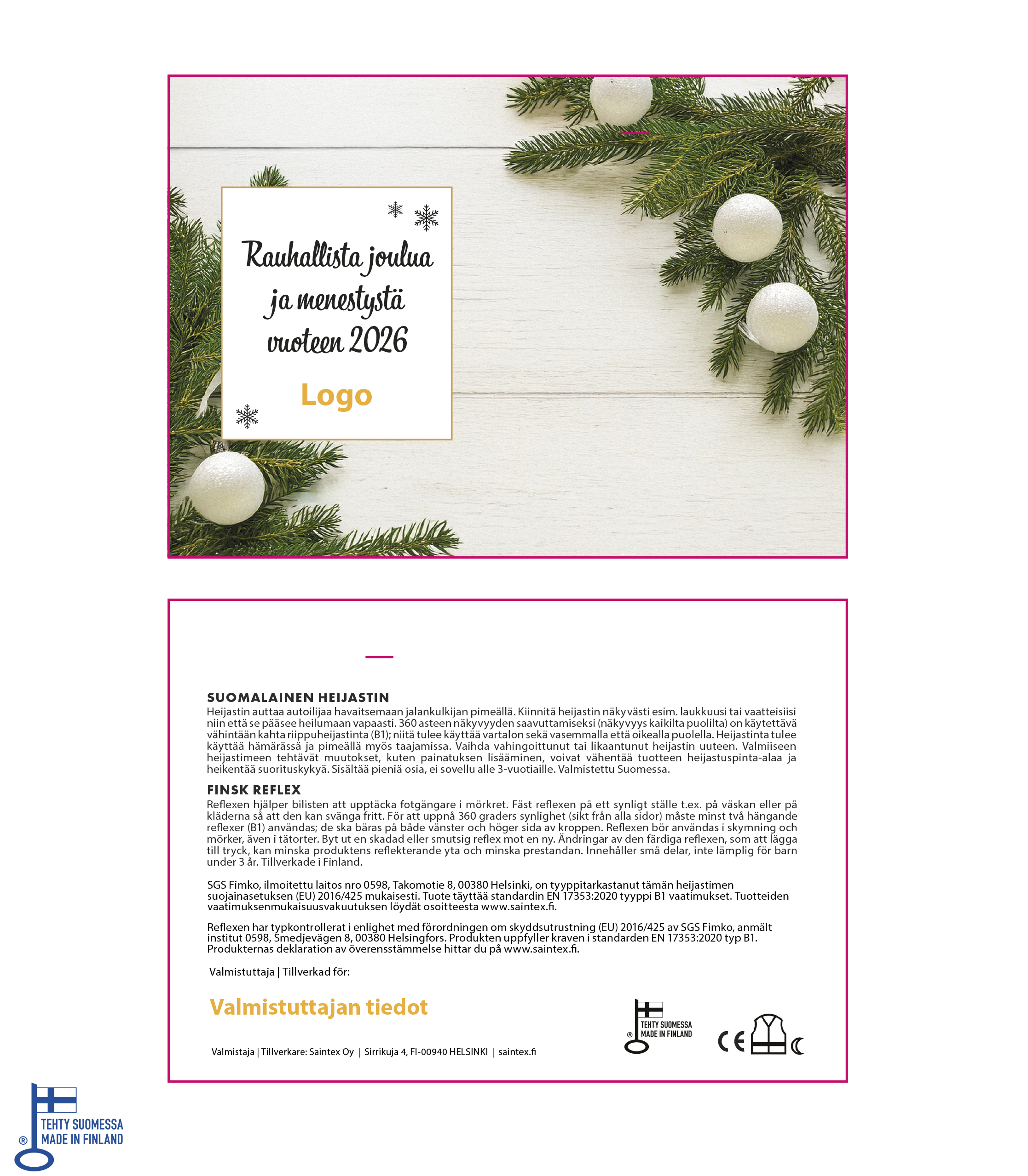 Joulukortti kotimaisella heijastimella. Kiva edullinen lahjavaihtoehto, jossa kortti välittää terveiset ja laadukas Suomessa valmistettu pehmoheijastin jää käyttöön. Lahja on myös avainlippu-tuote. Esimerkkiin sisältyy kortti painatuksella ja pehmoheijastin, jossa myös logopainatus yhdellä puolella. Minimitilausmäärä 200 kpl ja toimitusaika alkaen n. 2 viikkoa.