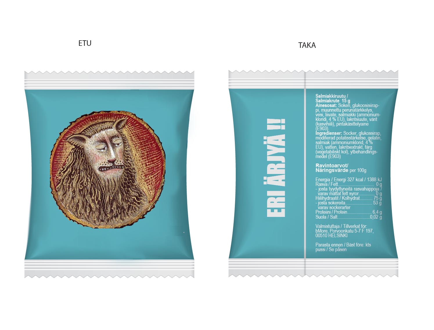 Kotimaiset salmiakit mainospussissa. Halvan isot ruutukarkit omalla logolla painetussa mainospussissa sopivat hyvin messujen jakotuotteeksi. Ison painoalan ansiosta pussiin saadaan tarvittaessa painettua paljonkin tekstiä ja logoja. Esim. monissa EU-rahoitteisissa projekteissa tulee mukaan saada useita monivärisiä logoja ja tässä se onnistuu helposti.