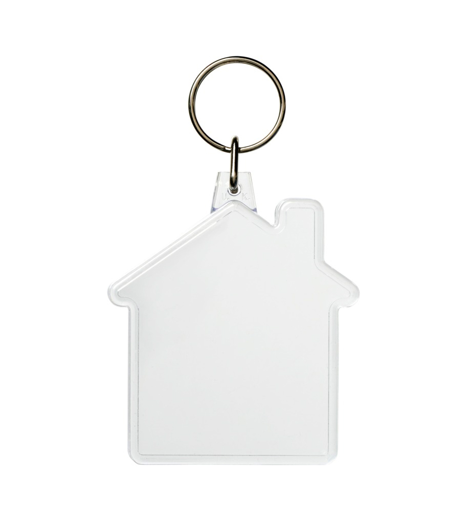 House shaped keyring manufactured in Europe. Clear, transparent keyring with a large printing area. The product has a metal key ring and, thanks to its low profile, the keyring is also suitable for mailing as a promotional gift. Minimum order quantity 250 pcs and delivery time from approx. 2 weeks. The example price includes full color digitally printed paper inside the product.